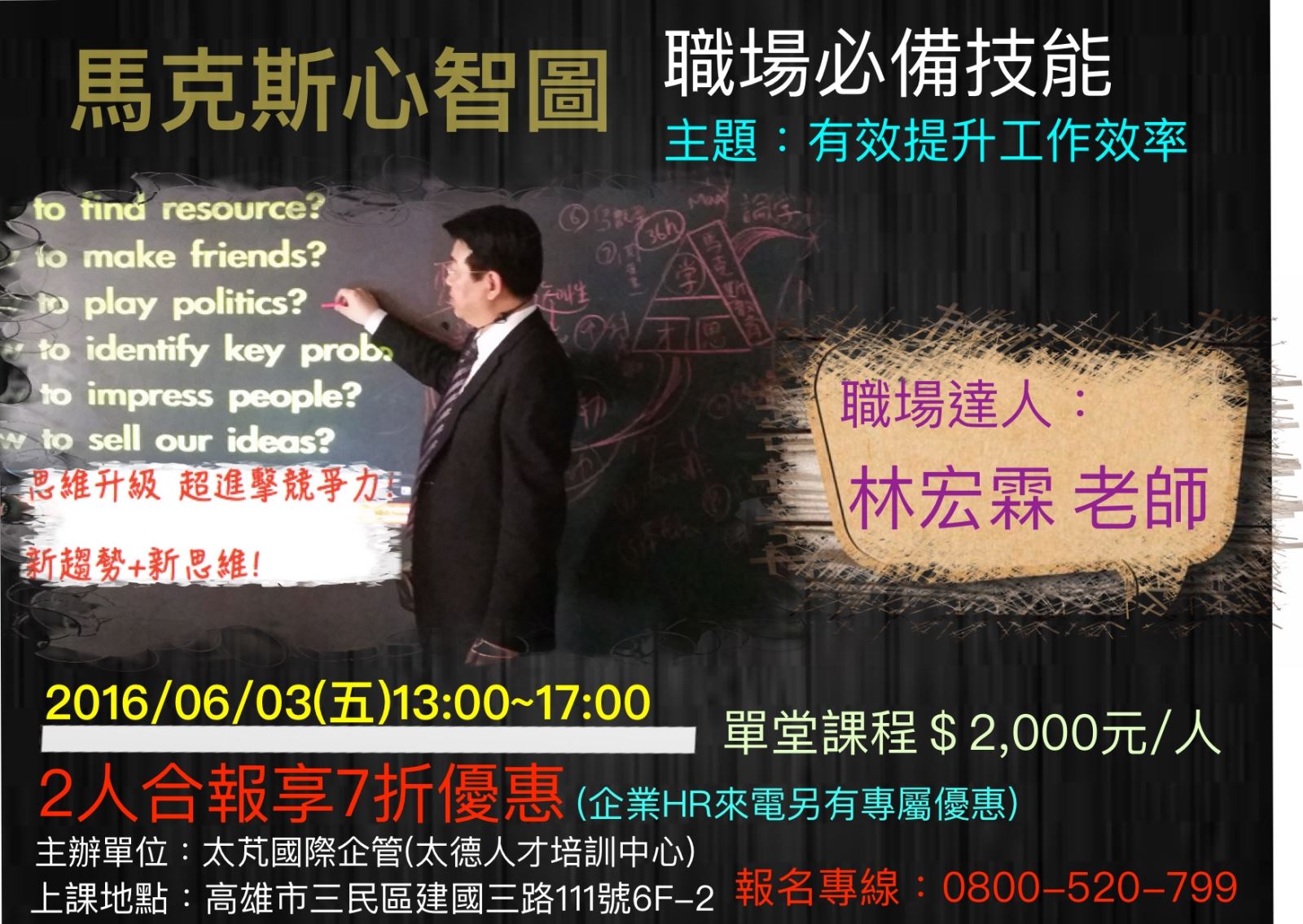 本課程透過馬克斯老師風趣且富有深度的授課,輕鬆學習運用心智圖法的技巧,以提升在邏輯思考、理解分析、工作運用的能力。從此在職場上,也能夠成為自我時間的管理者。